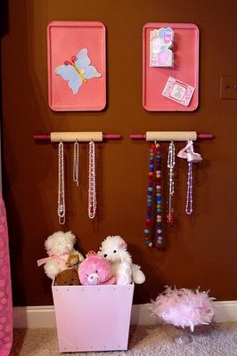 Baking sheets painted pink turn into a sweet magnetic memo board. The Dollar store is the perfect place to purchase baking sheets; make sure to buy nonstick or else it will be difficult getting the paint to "stick". Rolling pins